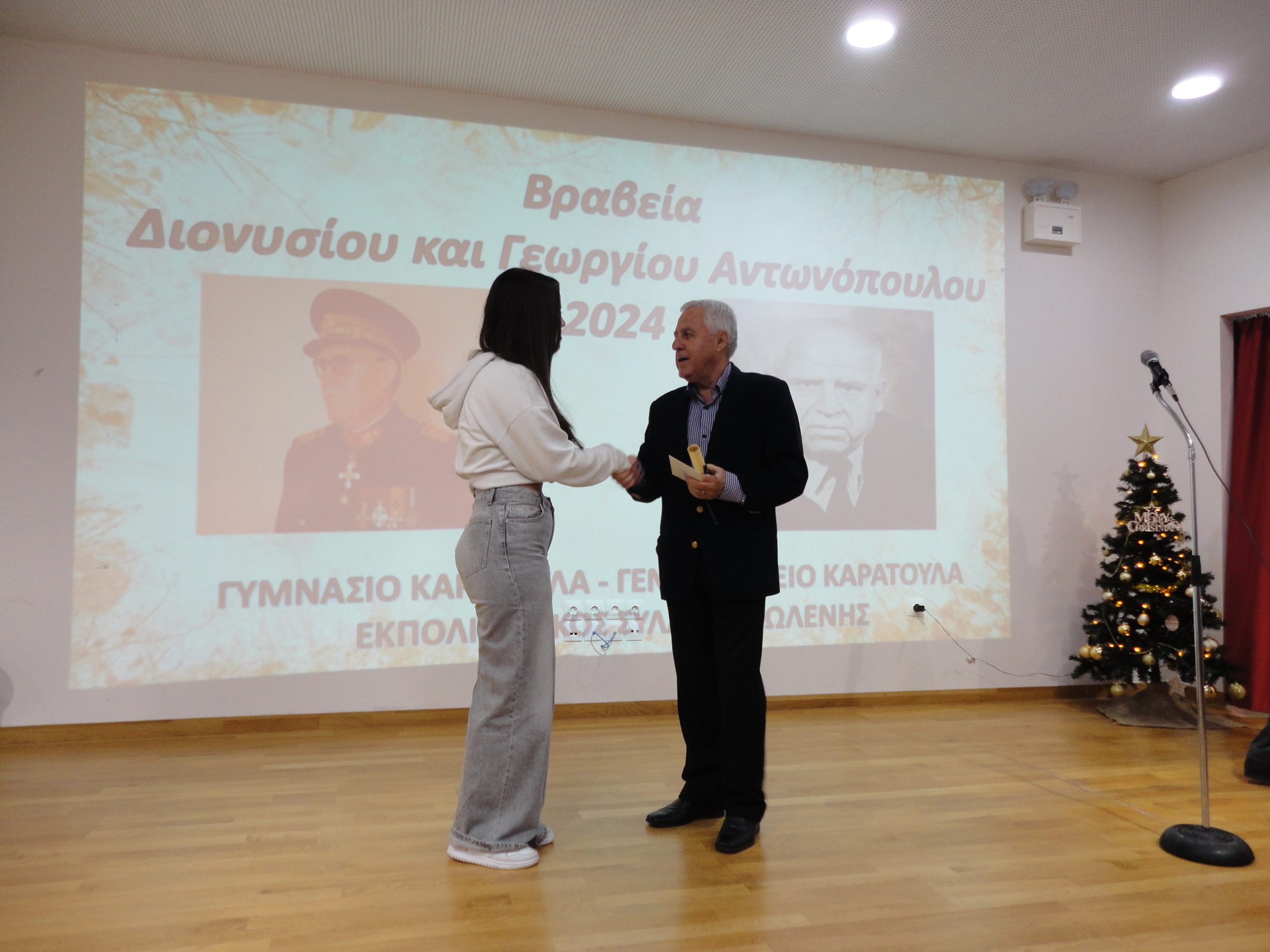 Μέσα σε μία συγκινησιακά φορτισμένη ατμόσφαιρα πραγματοποιήθηκε στην αίθουσα εκδηλώσεων του σχολικού συγκροτήματος Γυμνασίου-Λυκείου Καράτουλα, το πρωί της Παρασκευής, 22 Νοεμβρίου 2024, η απονομή των βραβείων «Διονυσίου και Γεωργίου Αντωνόπουλου» στους αριστεύσαντες μαθητές από τη Δημοτική Ενότητα Ωλένης.