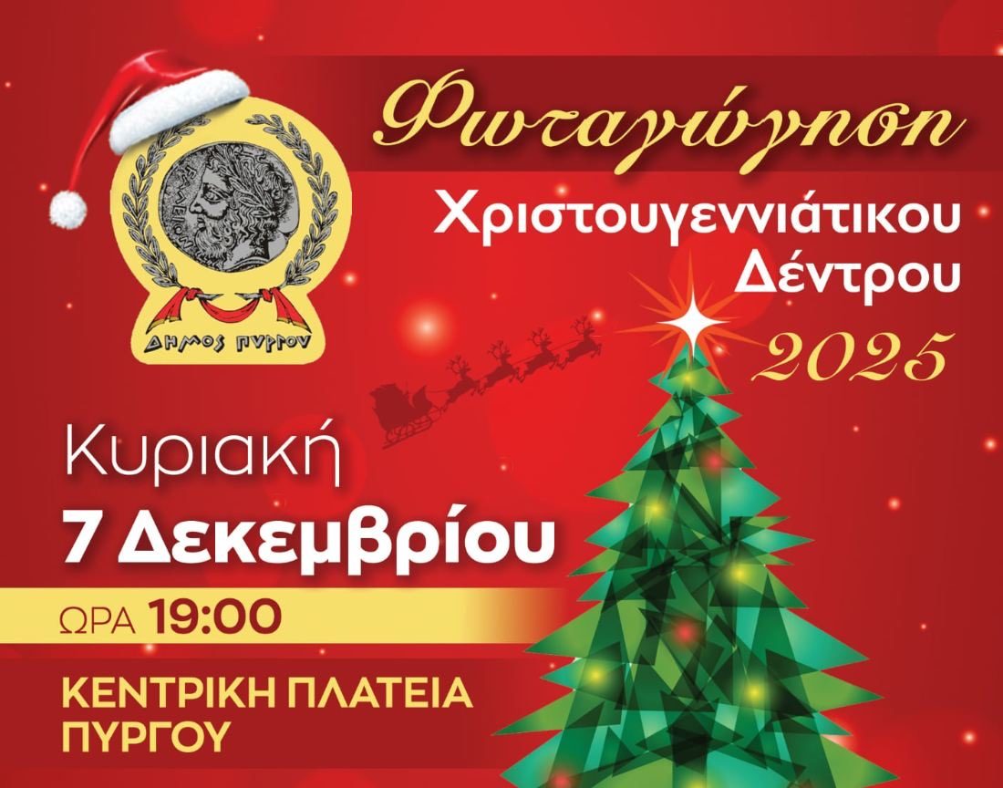 Ο Δήμος Πύργου σας προσκαλεί στην πιο αναμενόμενη και λαμπερή εκδήλωση του χρόνου, την επίσημη φωταγώγηση του Χριστουγεννιάτικου Δέντρου, την Κυριακή 7 Δεκεμβρίου στις 7:00 το απόγευμα στην Κεντρική Πλατεία Σάκη Καράγιωργα.