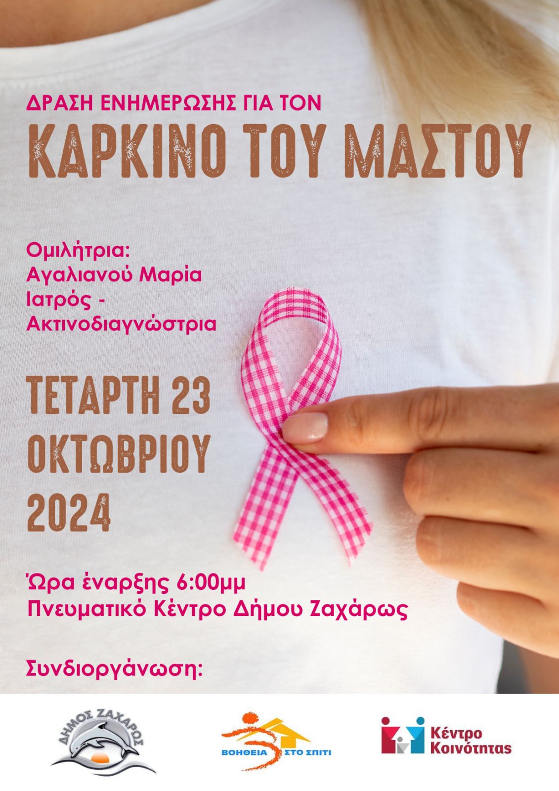 Ο Δήμος Ζαχάρως με το Κέντρο Κοινότητας και την Βοήθεια στο Σπίτι, διοργανώνει δράση ενημέρωσης για τον καρκίνο του μαστού, την Τετάρτη 23 Οκτωβρίου 2024 και ώρα 6:00μμ στο Πνευματικό Κέντρο του Δήμου Ζαχάρως με ομιλήτρια την κα. Αγαλιανού Μαρία – Ιατρός/Ακτινοδιαγνώστρια.