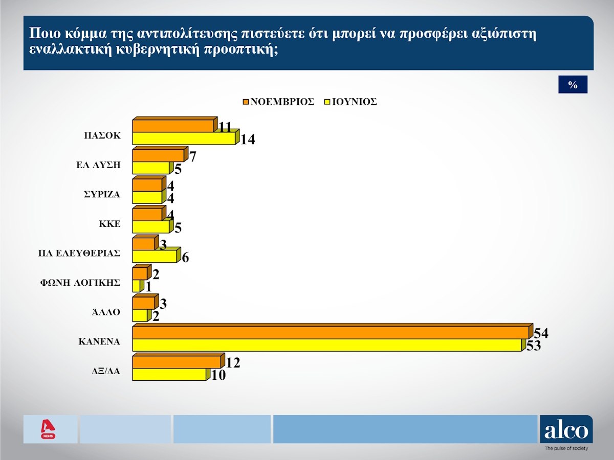 Ο χαμηλός βαθμός προς την κυβέρνηση και τον πρωθυπουργό μεταδίδεται και στην αντιπολίτευση. «Κανένα» κόμμα της αντιπολίτευσης δεν μπορεί να προσφέρει αξιόπιστη αντιπολίτευση λέει το 53% των ερωτηθέντων. Στην έρευνα μόνο το ΠΑΣΟΚ συγκεντρώνει διψήφιο ποσοστό που μετά βίας περνά το 10 και φτάνει στο 11%.