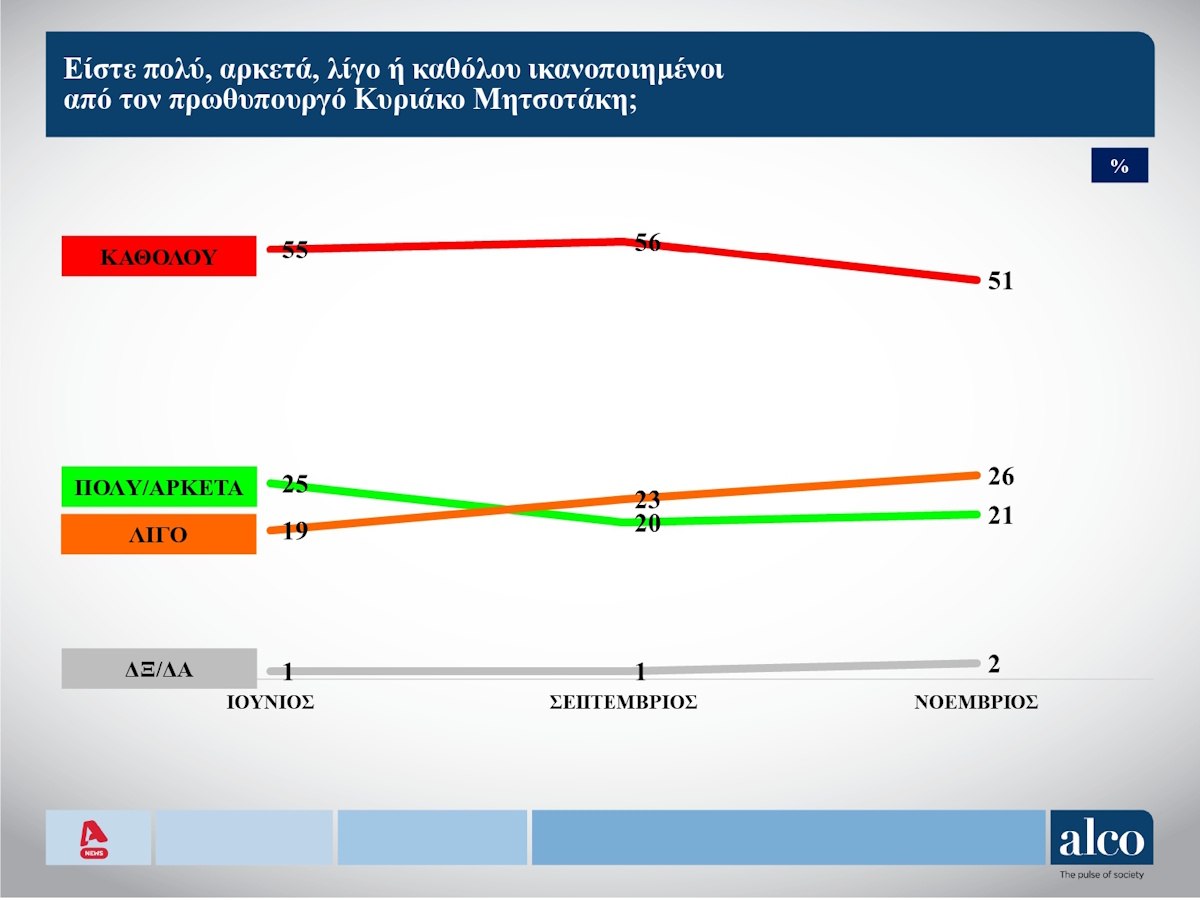Με την ακρίβεια να παραμένει πρώτο πρόβλημα η ικανοποίηση των πολιτών από την κυβέρνηση εξακολουθεί να παραμένει χαμηλή. Μόνο το 15% δηλώνει πολύ ή αρκετά ικανοποιημένο με το 48% να δηλώνει καθόλου και ένα 33% πολύ ή αρκετά.