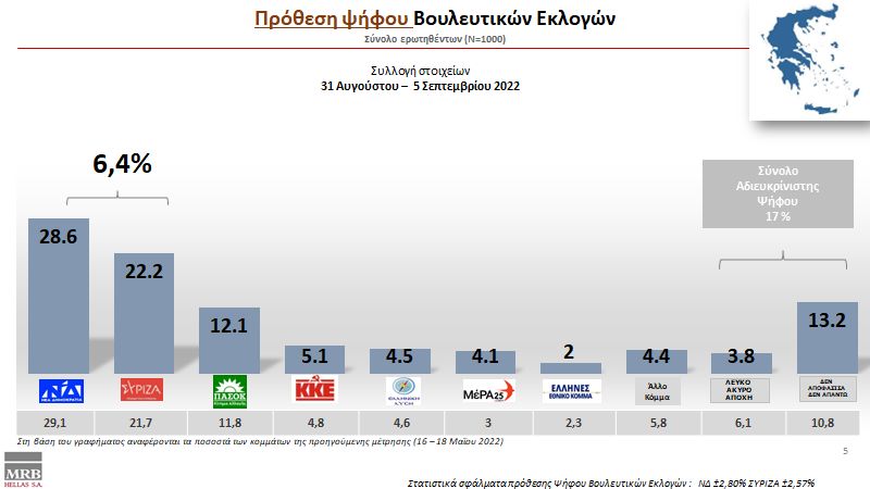 Σε σχέση με την πρόθεση ψήφου από το Νοέμβριο του 2021 μέχρι και σήμερα φαίνεται ότι η ψαλίδα κλείνει από τις 9,8 μονάδες στις 6,4.