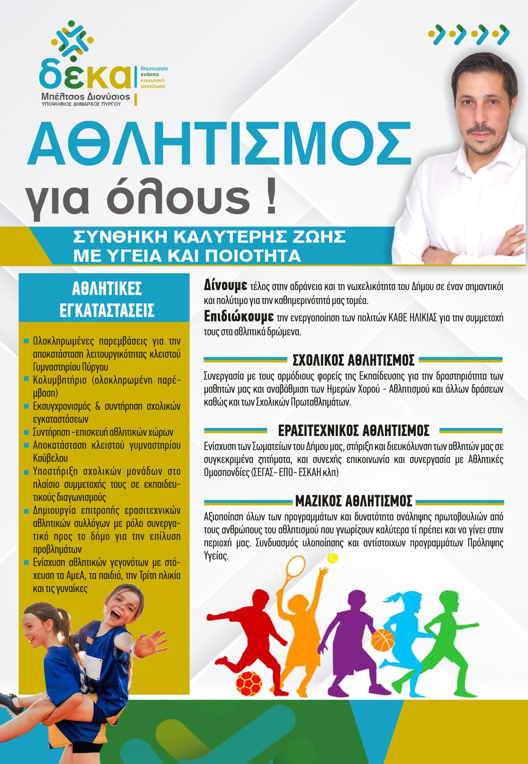 Δίνουμε τέλος στην αδράνεια και τη νωχελικότητα του Δήμου σε έναν σημαντικόι και πολύτιμο για την καθημερινότητά μας τομέα. Επιδιώκουμε την ενεργοποίηση των πολιτών ΚΑΘΕ ΗΛΙΚΙΑΣ για την συμμετοχή τους στα αθλητικά δρώμενα.
