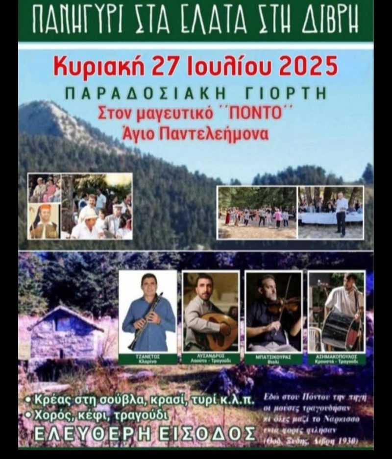 Θα είναι χαρά και τιμή για μας και την κωμόπολη της Δίβρης, να παραβρεθείτε στην από αιώνων μοναδική παραδοσιακή ΓΙΟΡΤΉ και ΠΑΝΉΓΥΡΗ της Δίβρης και των όμορων ορεινών χωριών Ηλείας – Αχαΐας – Αρκαδίας που γίνεται στην παραδεισένια θέση του “Πόντου” στα έλατα της Δίβρης.