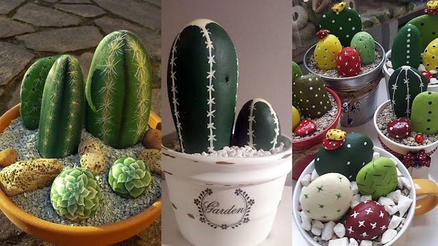 Στην συνέχεια με άσπρο ή μαύρο χρώμα και πολύ λεπτό πινελάκι σχεδιάστε πάνω στις πέτρες τελίτσες, λοξές γραμμούλες, Χ ή σταυρουδάκια ώστε να αποκτήσουν όσο πιο πειστική όψη κάκτων.