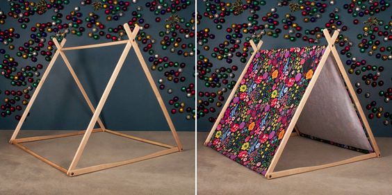 Πιο μόνιμες κατασκευές για κήπους, μπαλκόνια ή και για παιδικά δωμάτια μπορούν να κατασκευαστούν με την χρήση ενός απλού τριγωνικού σκελετού από καρφωμένα ξύλινα πηχάκια στις δύο πλευρές των οποίων θα προσαρμόσετε ύφασμα που θα το στερεώσετε – κολλήσετε με πιστόλι σιλικόνης.
