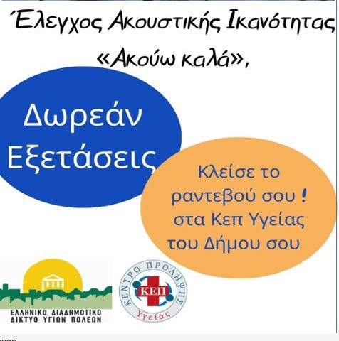 Ο Δήμος Πύργου, μέσω του ΚΕΠ Υγείας και του Διευρυμένου Κέντρου Κοινότητας, σε συνεργασία με το Ελληνικό Διαδημοτικό Δίκτυο Υγιών Πόλεων του Π.Ο.Υ., διοργανώνει δωρεάν ελέγχους ακουστικής ικανότητας για δημότες άνω των 50 ετών, στους οποίους έχει διαπιστωθεί μείωση της ακοής τους.