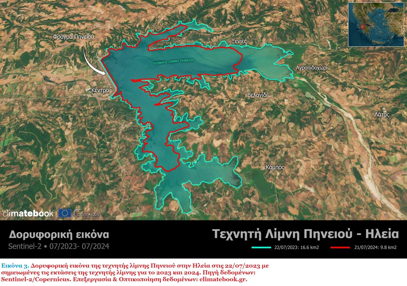 Η έκταση της τεχνητής Λίμνης του Πηνειού για την συγκεκριμένη χρονική περίοδο υπολογίζεται ως μία από τις 2 μικρότερες από το 2000 που υπάρχουν δορυφορικές παρατηρήσεις πολύ υψηλής ανάλυσης. Αντίστοιχες χρονιές ξηρασίας στην περιοχή ήταν το 2008 και το 2002.