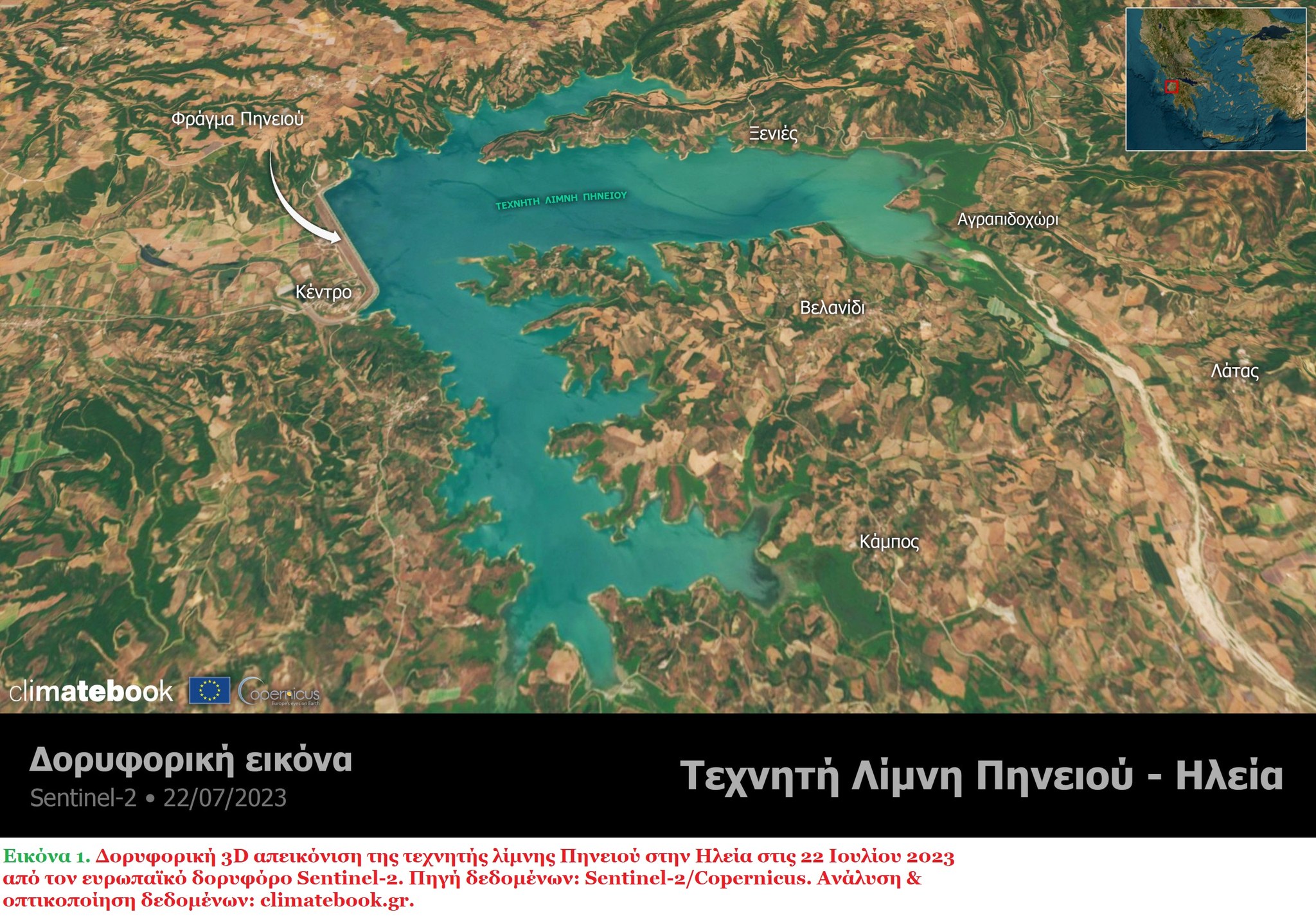 Εικόνα 1. Δορυφορική 3D απεικόνιση της τεχνητής λίμνης Πηνειού στην Ηλεία στις 22 Ιουλίου 2023 από τον ευρωπαϊκό δορυφόρο Sentinel-2.