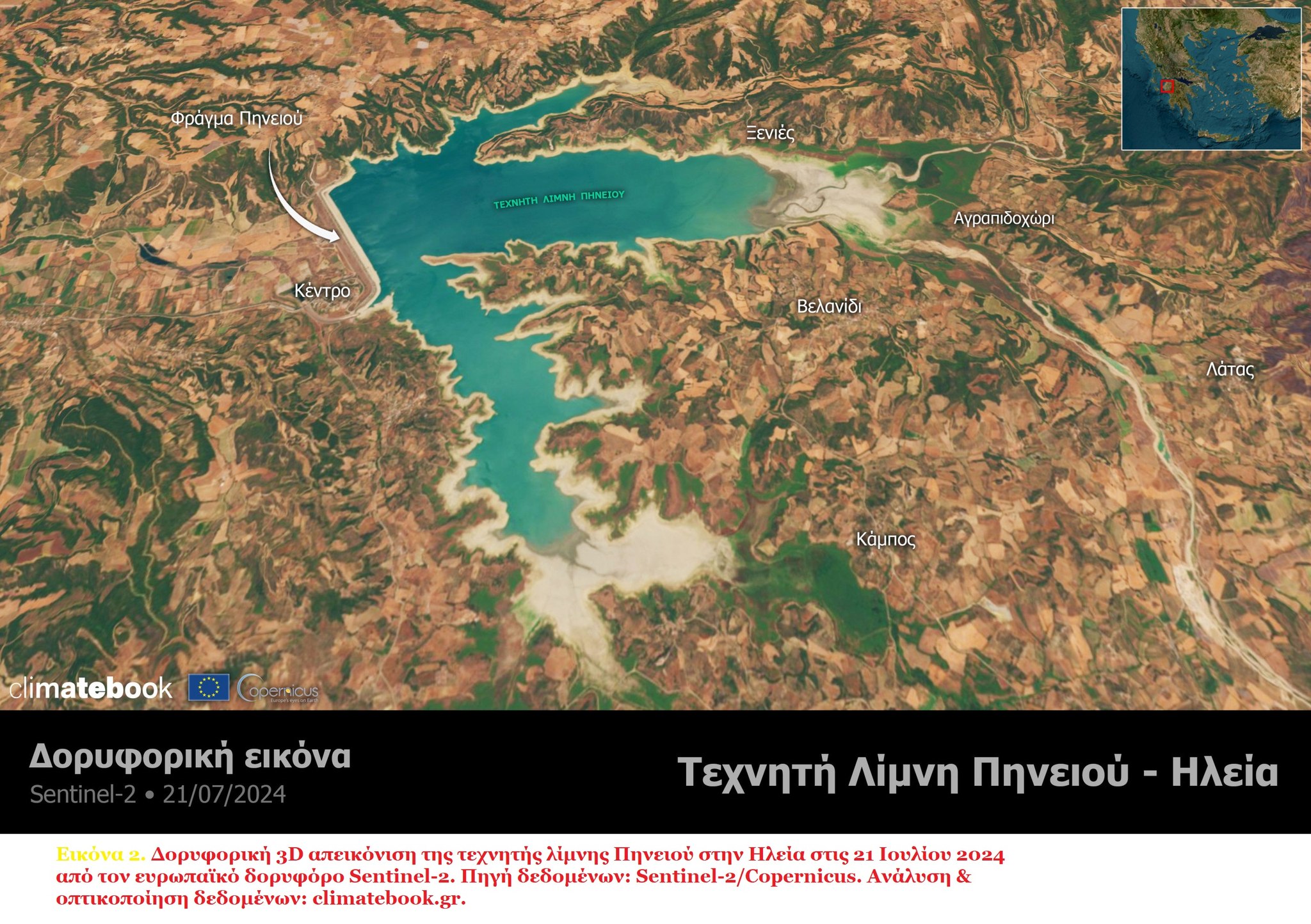 Εικόνα 2. Δορυφορική 3D απεικόνιση της τεχνητής λίμνης Πηνειού στην Ηλεία στις 21 Ιουλίου 2024 από τον ευρωπαϊκό δορυφόρο Sentinel-2.