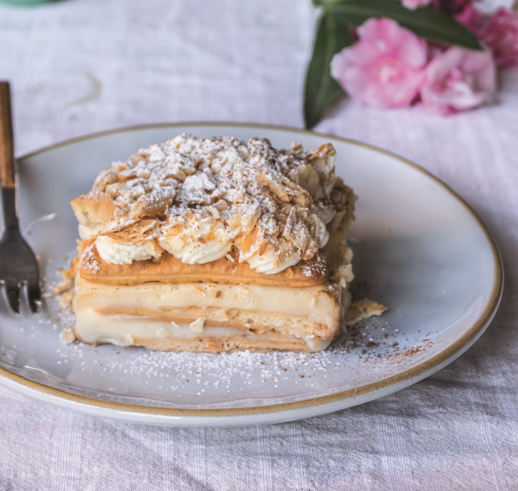 Απλώνουμε την υπόλοιπη σαντιγί και τοποθετούμε στο ψυγείο για 3 ώρες. Σερβίρουμε το μιλφέιγ με τριμμένα cream crackers από πάνω και ζάχαρη άχνη