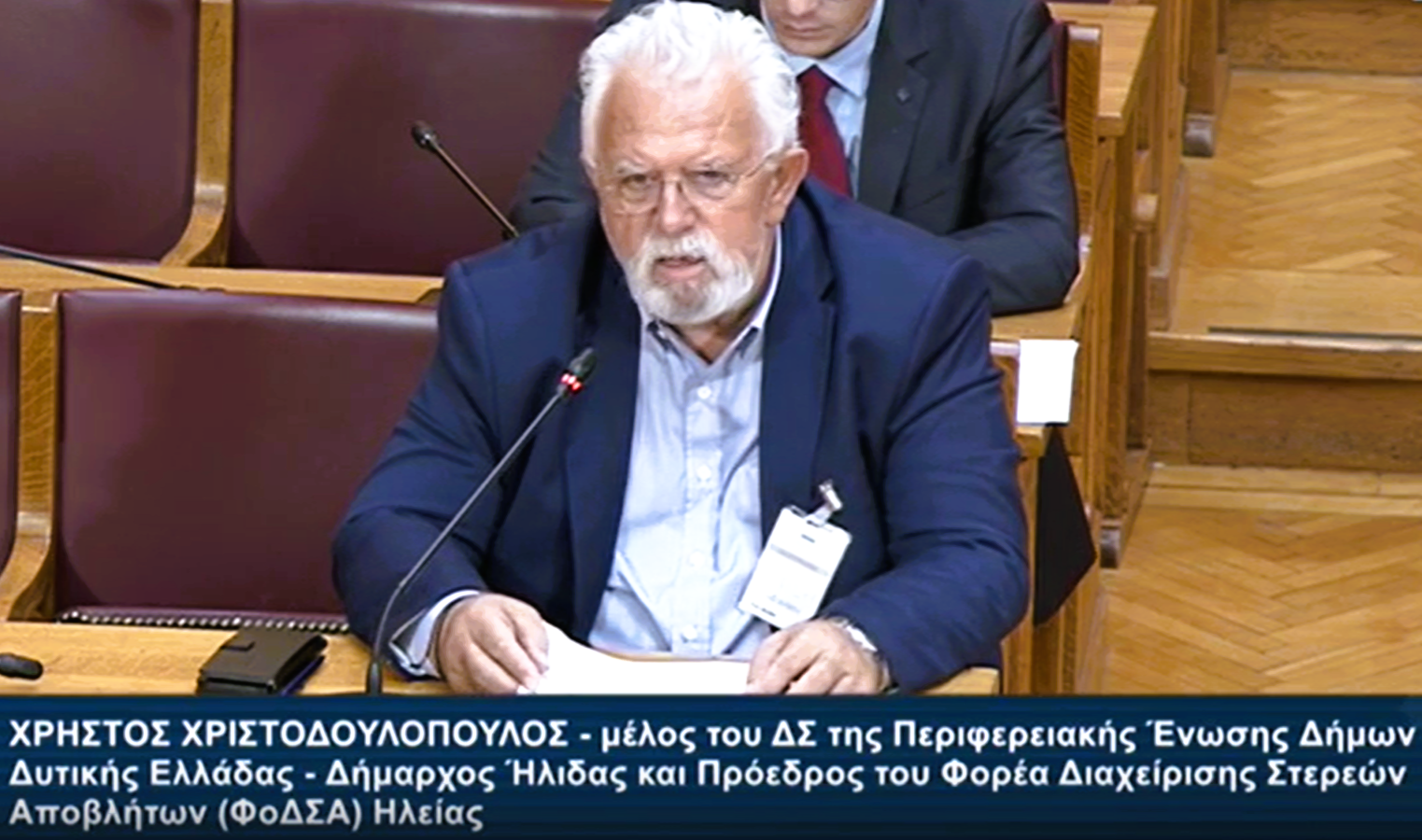 Λίγο πριν το Ελληνικό κοινοβούλιο προχωρήσει στην επικύρωση του νέου νομοσχεδίου του Υπουργείου Περιβάλλοντος και Ενέργειας, στο οποίο προβλέπεται η συγχώνευση των ΦοΔΣΑ Ηλείας, Αχαΐας και Αιτωλοακαρνανίας σε έναν ενιαίο φορέα για τη Δυτική Ελλάδα με έδρα την Πάτρα, ο δήμαρχος Ήλιδας κ. Χρήστος Χριστοδουλόπουλος σε μια ύστατη προσπάθεια ως πρόεδρος του ΦοΔΣΑ Ηλείας και εκπρόσωπος της ΠΕΔ Δυτικής Ελλάδας, συμμετείχε στην αρμόδια επιτροπή Παραγωγής και Εμπορίου της Βουλής, στην οποία συζητήθηκε το σχέδιο νόμου «Ρυθμίσεις για τον εκσυγχρονισμό της διαχείρισης αποβλήτων, τη βελτίωση του πλαισίου εξοικονόμησης ενέργειας, την ανάπτυξη των έργων