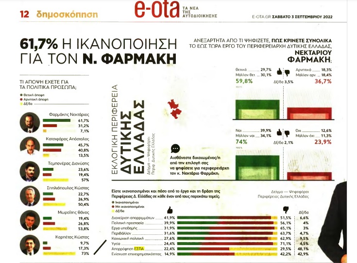 Όπως φαίνεται στην έρευνα, το ποσοστό ικανοποίησης από την μέχρι τώρα πορεία του Ν.Φαρμακη αγγίζει το 61,7,%(!) στο εκλογικό σώμα, προβληματίζοντας κάθε άλλο διεκδικητή.