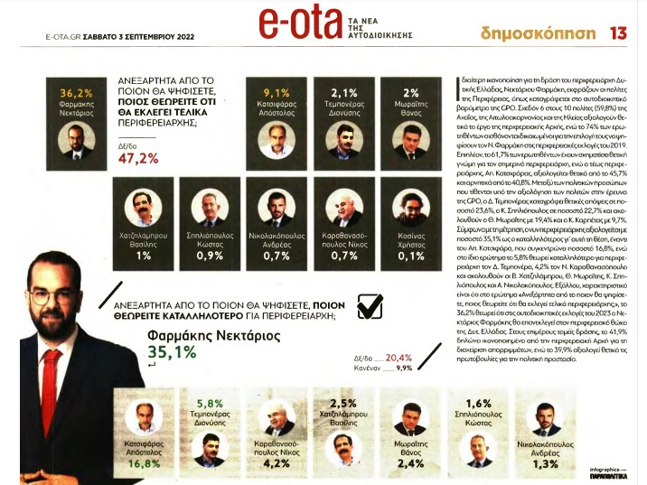Μια δημοσκόπηση για τα “Παραπολιτικά” που βλέπει το φως της δημοσιότητας, θέτει σαφές πλαίσιο στις επερχόμενες εκλογές για την Περιφέρεια Δυτικής Ελλάδας καθώς φέρνει τον Περιφερειάρχη Νεκτάριο Φαρμάκη σε εξαιρετικά πλεονεκτική θέση σε σχέση με τους αντιπάλους του.