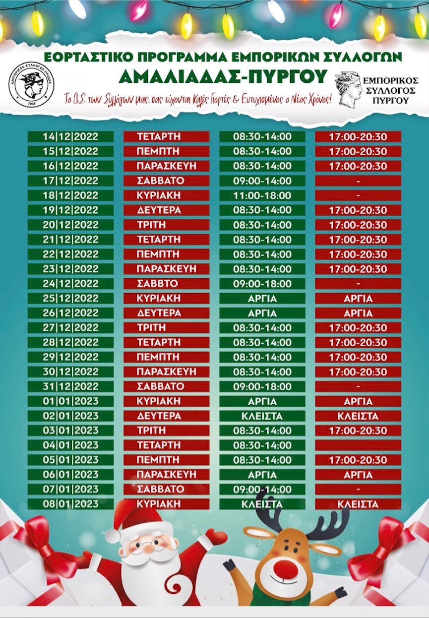 – Το Σάββατο 24/12 και το Σάββατο 31/12 όπου είναι αντίστοιχα οι παραμονές Χριστουγέννων και Πρωτοχρονιάς, θα είναι από 09:00 έως 18:00.