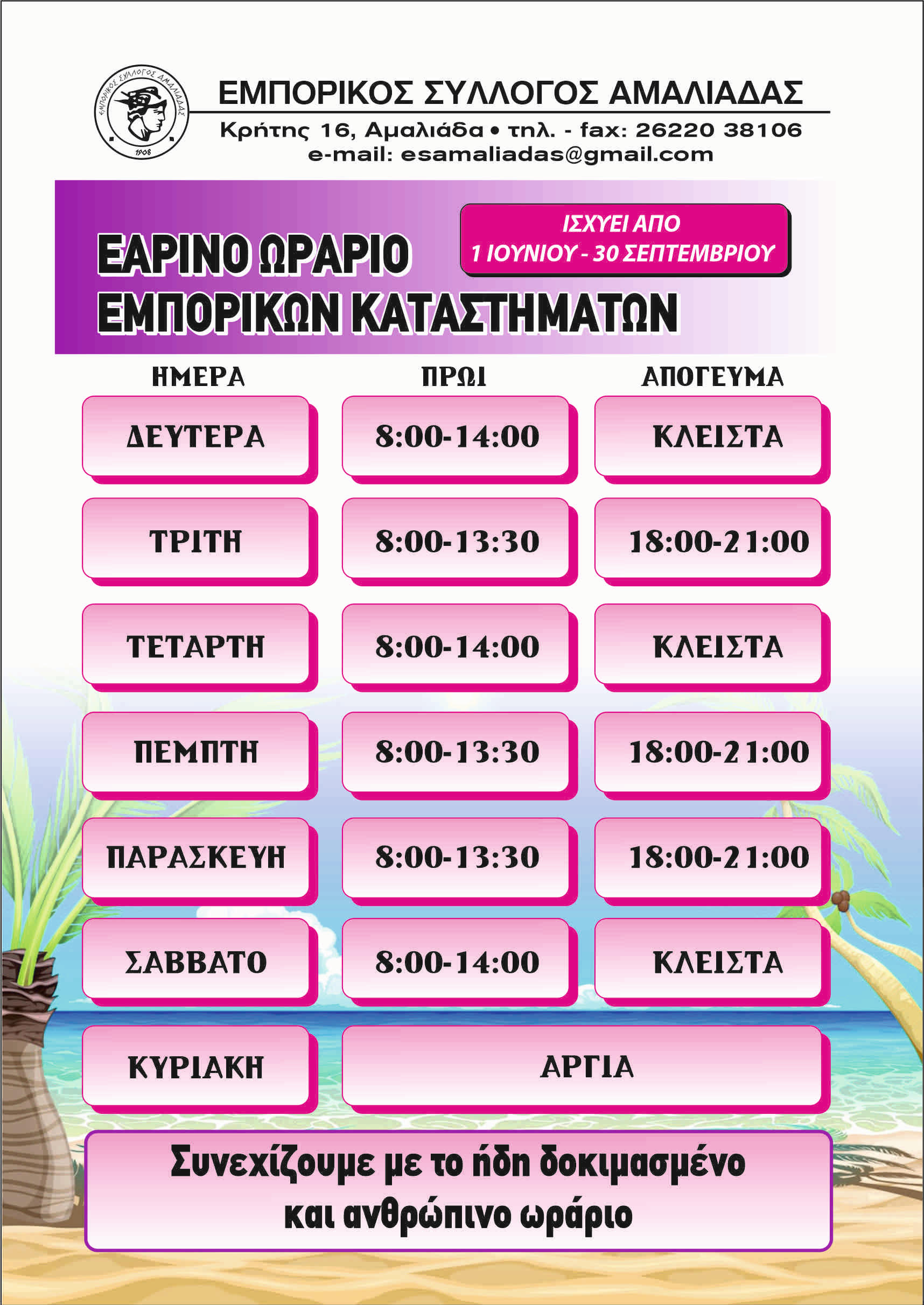 Ο Εμπορικός Σύλλογος Ήλιδας ενημερώνει το καταναλωτικό κοινό ότι το θερινό ωράριο των καταστημάτων από την Δευτέρα 02/06/2025 διαμορφώνεται ως εξής: