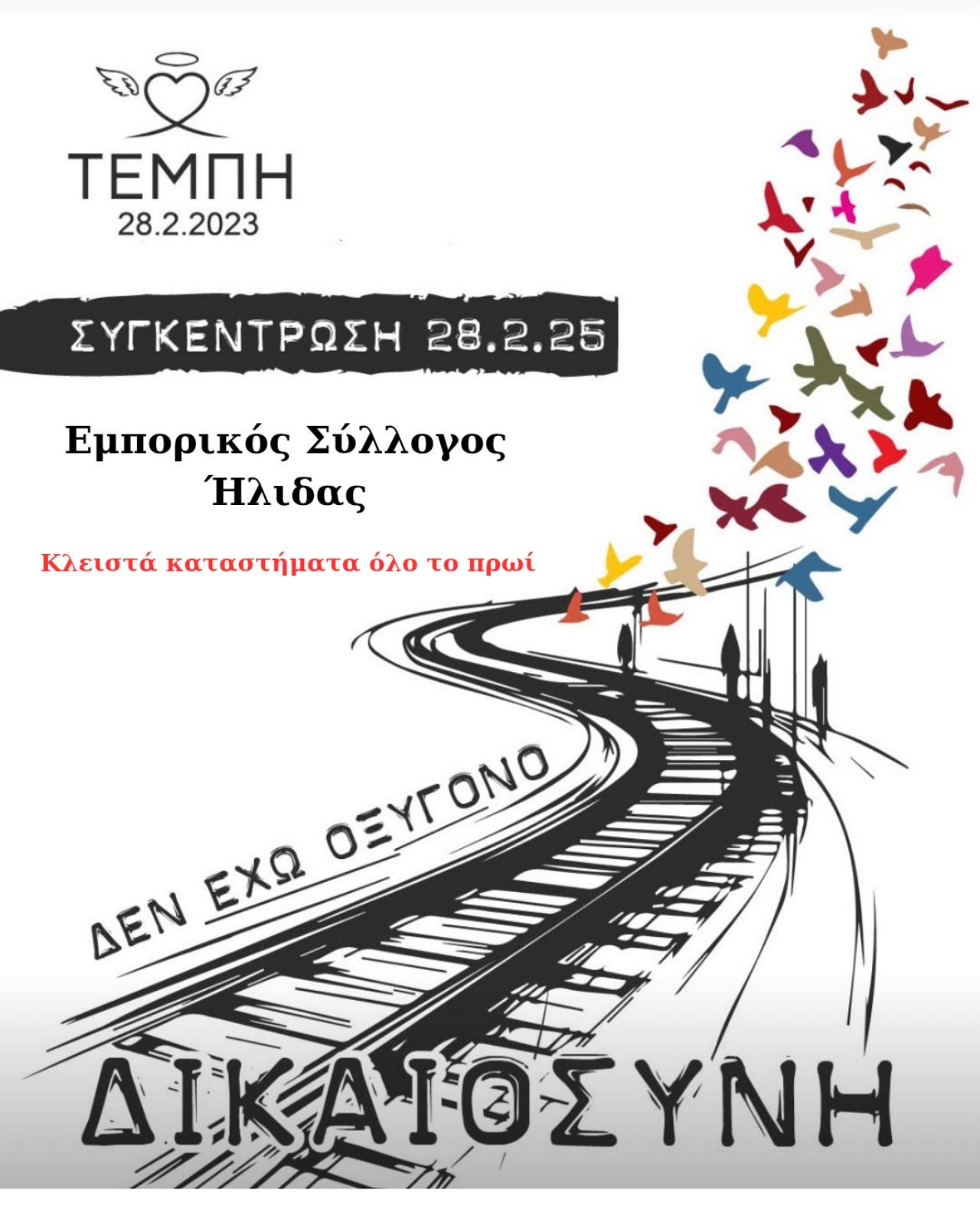 Ο Εμπορικός Σύλλογος Ήλιδας συμμετέχοντας στις πανελλαδικές κινητοποιήσεις για τα δύο χρόνια από το δυστύχημα των Τεμπών, αποφάσισε τα καταστήματα να παραμείνουν κλειστά το πρωί της Παρασκευής 28 – 02 – 2025 και καλεί τα μέλη του στην συγκέντρωση που θα πραγματοποιηθεί την ίδια μέρα στην Πλατεία Αγ. Αθανασίου στις 10:00 π.μ..