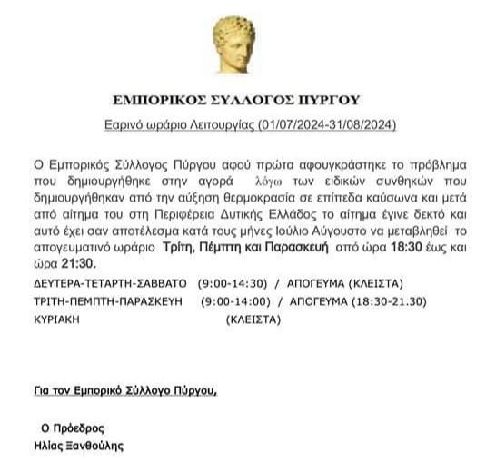 “Ο Εμπορικός Σύλλογος Πύργου αφού πρώτα αφουγκράστηκε το πρόβλημα που δημιουργήθηκε στην αγορά λόγω των ειδικών συνθηκών που δημιουργήθηκαν από την αύξηση θερμοκρασίας σε επίπεδα καύσωνα και ύστερα από αίτημα που διατύπωσε στην Περιφέρεια Δυτικής Ελλάδας, αίτημα που έγινε δεκτό, και έχει σαν αποτέλεσμα κατά τους μήνες Ιούλιο και Αύγουστο να μεταβληθεί το απογευματινό ωράριο που πλέον έχει ως εξής: