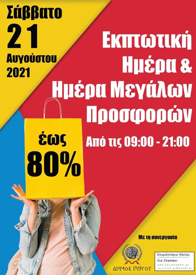 Συγκεκριμένα, στο πλαίσιο της ενίσχυσης της αγοράς, τα  εμπορικά καταστήματα στον Πύργο την 21η Αυγούστου θα είναι ανοιχτά όλη την ημέρα, από τις 9.00 πμ έως τις 21:00 το βράδυ, έχοντας μεγάλες προσφορές.