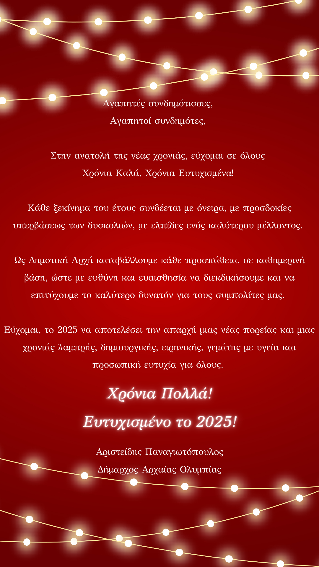 Ευχές Δημάρχου Αρχ. Ολυμπίας Άρη Παναγιωτόπουλου για τον νέο χρόνο