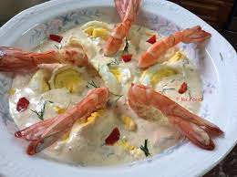 Πρώτα, σε ένα βαθύ μπολ ανακατεύουμε καλά όλα τα υλικά εκτός από τις γαρίδες, την πατάτα και τα αγγουράκια.