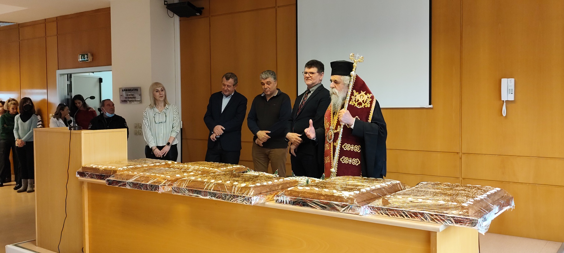 Στην κοπη της πίτας παρευρέθηκαν ο Σεβασμιότατος μητροπολίτης Ηλείας και Ωλένης Αθανάσιος, ο Πρόεδρος της ΠΟΕΔΗΝ Μιχάλης Γιαννάκος καθώς και Ο Διοικητής Πολίτης Σπυρίδων μαζί με τις διοικήτριες Πετροπούλου Μαρία και Παπαδοπούλου Αριστέα των νοσοκομείων Αμαλιάδας και Κρέστενων αντιστοιχα.