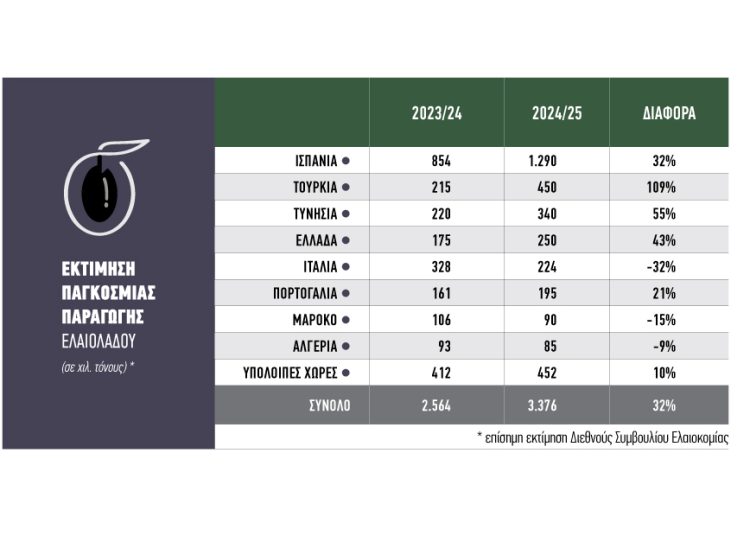 Από την Ισπανία το…περίμεναν οι κλαδικοί αναλυτές, όµως από Τουρκία και Τυνησία φαίνεται πως έρχεται (στα χαρτιά τουλάχιστον) το …σοκ προσφοράς στην αγορά ελαιολάδου, µε την παγκόσµια παραγωγή να εκτιµάται στους 3,4 εκατ. τόνους, µε την συµµετοχή των εξωκοινοτικών αγορών να διασπά ανοδικά τους 1,2 εκατ. τόνους για πρώτη φορά µετά την περίοδο 2021/22, έναντι 700-900 χιλιάδων που συνηθιζόταν. Τα νούµερα από µόνα τους λένε λίγα πράγµατα, όµως για πρώτη φορά έχουµε την εκτίµηση πως η παγκόσµια κατανάλωση θα παίξει πάνω από 3 εκατ. τόνους την φετινή σεζόν.