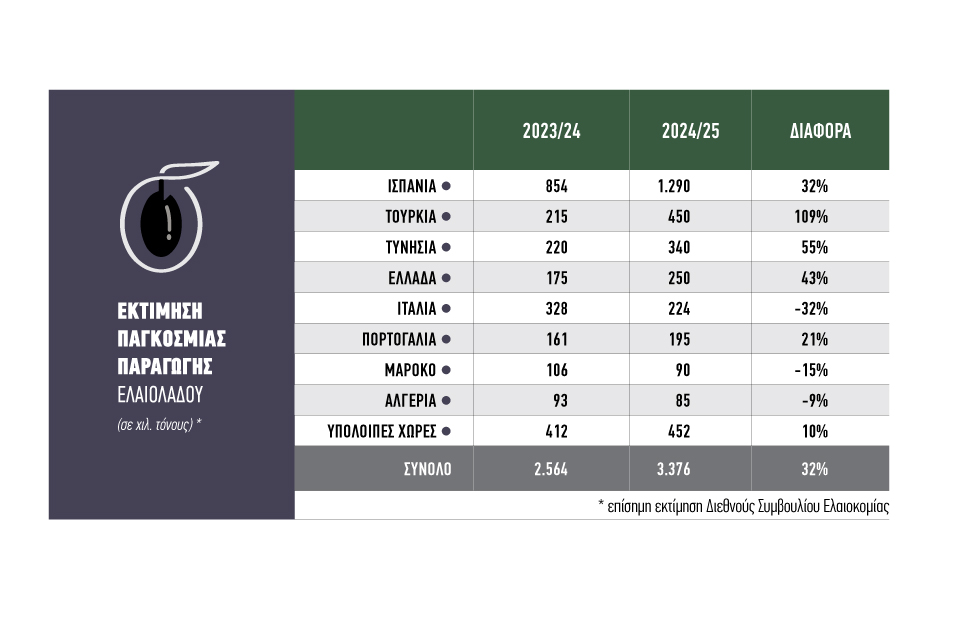 Tελευταίες µέρες του 2024, η αγορά ελαιολάδου γνώρισε τα χαµηλά της εµπορικής σεζόν 2024/25 και αναζητά τους επόµενους τρεις µήνες τα υψηλά της. Αυτή την αίσθηση αφήνει η ανάγνωση του παγκόσµιου ισοζυγίου που έδωσε στη δηµοσιότητα στις 17 ∆εκεµβρίου το ∆ιεθνές Συµβούλιο Ελαιολάδου σε συνδυασµό µε τις τιµολογιακές εξελίξεις στην Ιβηρική χερσόνησο.