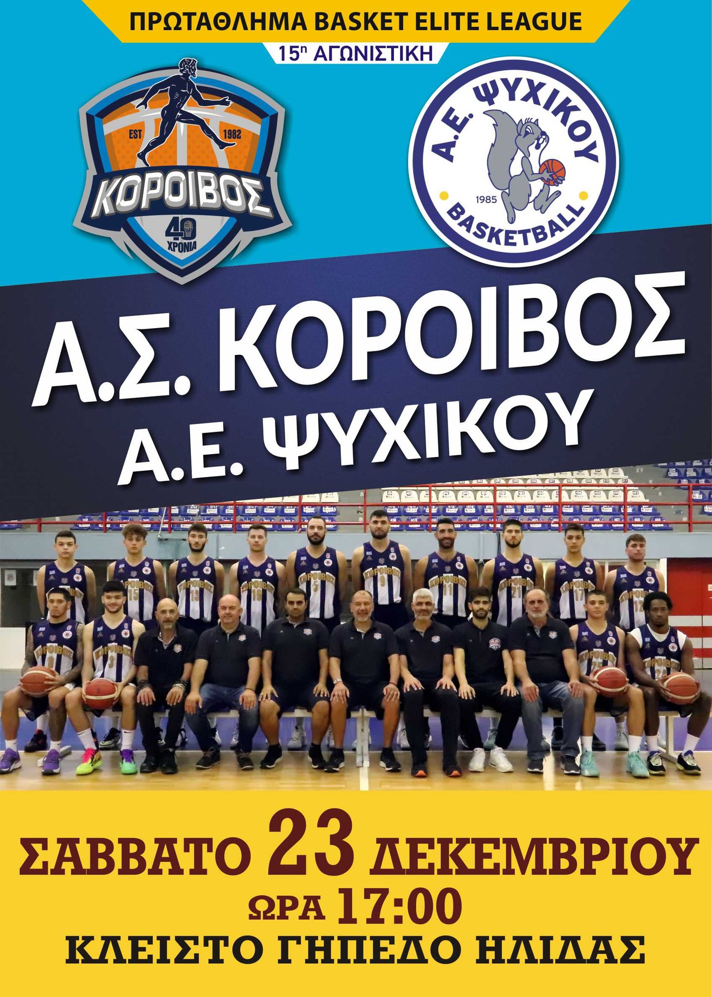 Ο Κόροιβος έδωσε το Σάββατο 23/12 το ματς για την 15η αγωνιστική (τελευταία του α’ γύρου καθώς και τελευταία ημερολογιακά για το 2023) του πρωταθλήματος της Elite League, αγωνιζόμενος εντός έδρας στο κλειστό Ήλιδας με την Α.Ε. Ψυχικού, όπου πήρε σημαντική νίκη με 70-66 σκορ. Με την ηλειακή ομάδα να δυσκολεύεται, σε ένα πολύ αμφίρροπο όπως εξαρχής εξελίχθηκε ματς, αλλά τελικά να τα καταφέρνει και να κάνει πάρα πολύ καλό τελείωμα του πρώτου γύρου του πρωταθλήματος και μέσα στην πρώτη τετράδα της βαθμολογίας.