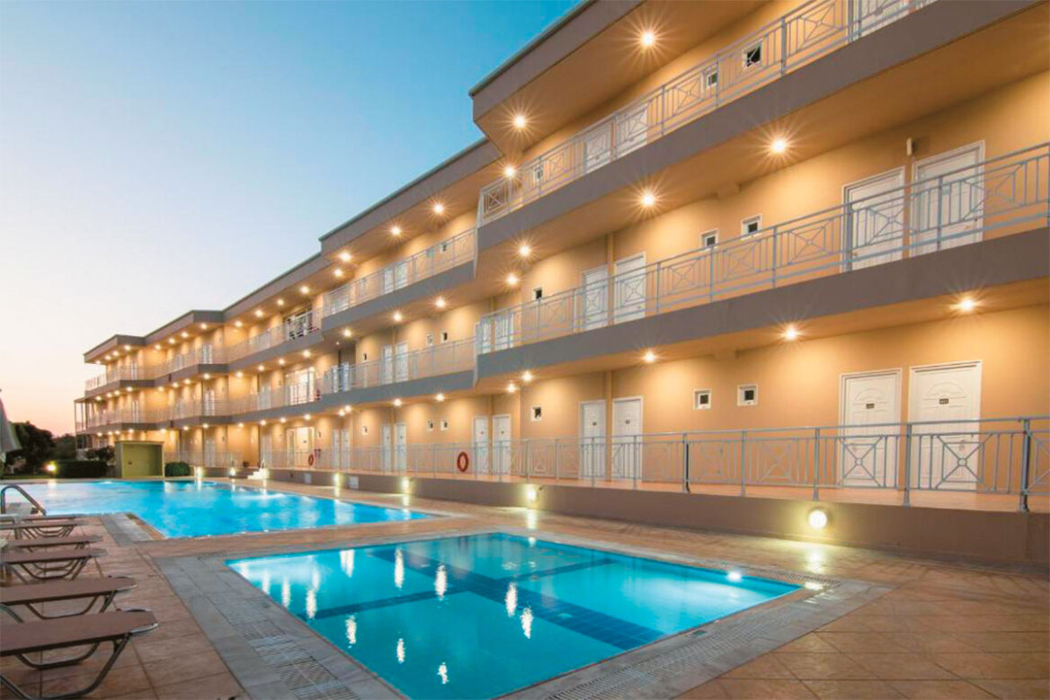 Πρόκειται για μεγάλο συγκρότημα που αποτελείται από 5 κτίρια και αναπτύσσεται σε οικόπεδο 9,5 στρεμμάτων μπροστά στη θάλασσα. Η επιχείρηση βρίσκεται αντιμέτωπη με τους πλειστηριασμούς εδώ και περίπου μία τριετία. Τα κτίρια είναι συμβατικής κατασκευής από οπλισμένο σκυρόδεμα, με στέγη κεκλιμένης πλάκας και επικάλυψη κεραμιδιών, κουφώματα ξύλινα και αλουμινίου και εξωτερικές επενδύσεις με πέτρα, ενώ το συνολικό εμβαδόν τους φτάνει τα 4.251 τ.μ..