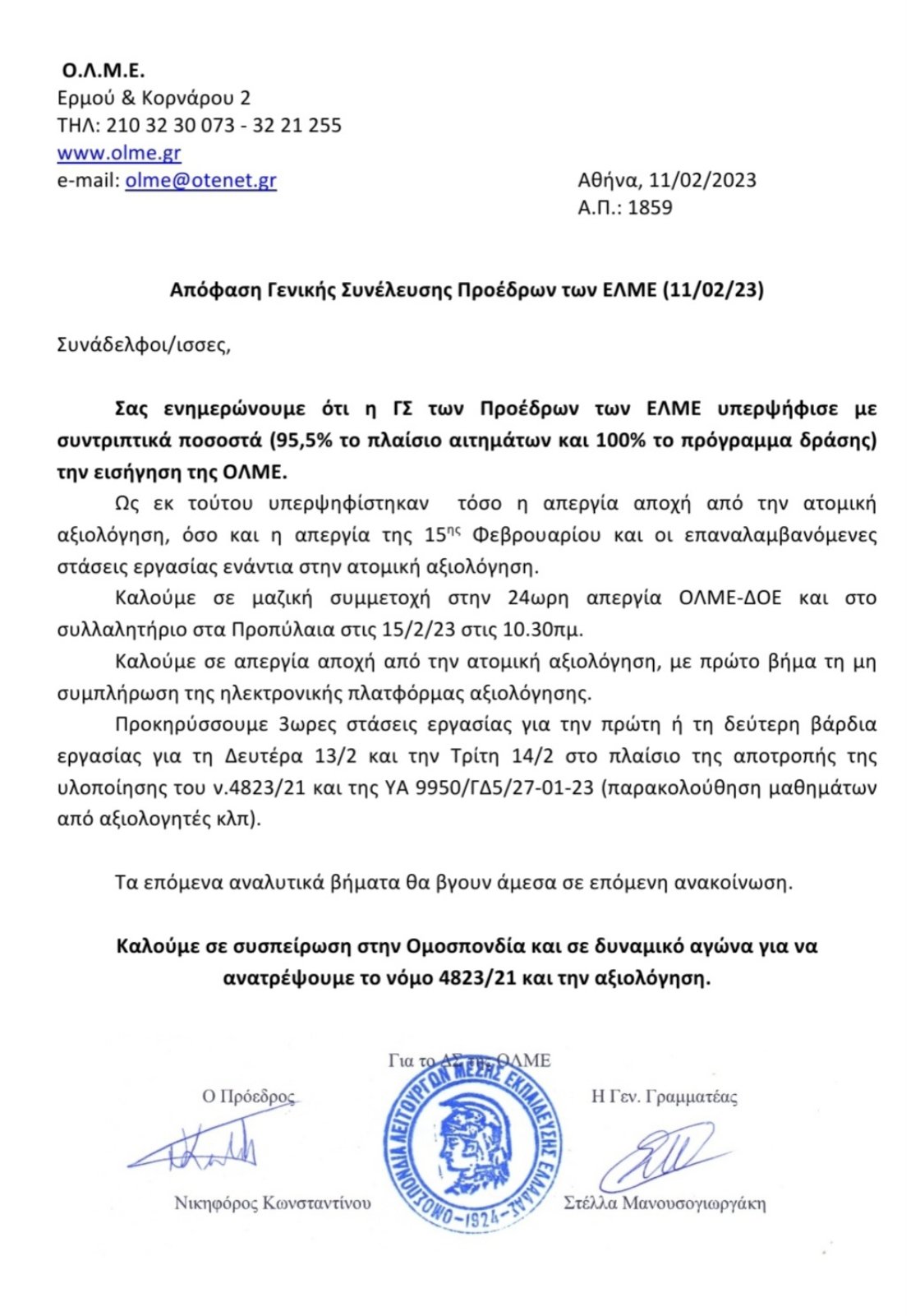 Το ΔΣ της ΕΛΜΕ Ηλείας μετά την ομόφωνη απόφαση της Γενικής Συνέλευσης τωνΠροέδρων των ΕΛΜΕ για κήρυξη Απεργίας-Αποχής από την ατομική αξιολόγηση και πανεκπαιδευτική απεργία μαζί με τη ΔΟΕ, καλεί όλες και όλους τους συναδέλφους σε μαζική συμμετοχή στην απεργιακή συγκέντρωση την Τετάρτη 15 Φλεβάρη και ώρα 10:30 π.μ. στην Κεντρική Πλατεία του Πύργου μαζί με τους συλλόγους δασκάλων του νομού.