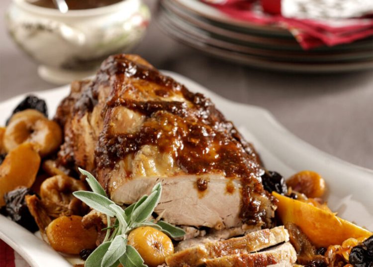 Αυτά είναι τα υλικά που χρησιμοποιεί η αείμνηστη Εύη Βουτσινά, δεινή μαγείρισσα με γνώσεις βαθιές της ελληνικής μαγειρικής παράδοσης, για το κύριο πιάτο αυτού του μενού: φτιάχνει χοιρινό (από στρογγυλό-κιλότο) ψητό κατσαρόλας, με κυδώνια, ξερά φρούτα και ωραίες ταιριαστές μυρωδιές.