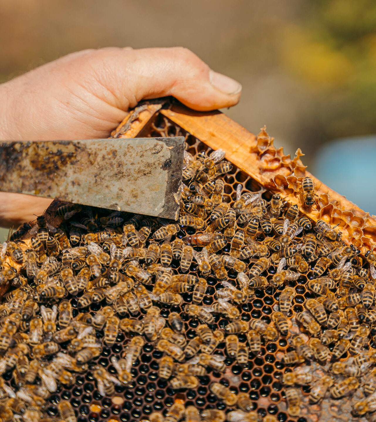 Πλησιάζουμε και έχουμε ήδη φορέσει τις μάσκες με προσοχή. Η Αμαλία προσπαθεί να βρει τον τρόπο που θα φοράει τη μάσκα με το διχτάκι για να μπορεί να κάνει τις λήψεις. Τον βρίσκει. Ο Γιώργος προετοιμάζει το καπνιστήρι. Ανάβει φωτιά χρησιμοποιώντας τα κλαδιά που τον συναντήσαμε να κόβει νωρίτερα. Τα τοποθετεί σε αυτό το μεταλλικό σκεύος, και ανάβει φωτιά. «Ο καπνός κάνει τις μέλισσες να ηρεμούν και να μην γίνονται επιθετικές.» Ανοίγει τις κυψέλες με προσοχή και βγάζει ένα από τα τελάρα. Εκατοντάδες μέλισσες εργάζονται, αγνοώντας την ύπαρξή μας. «Οι μέλισσές δεν είναι επιθετικές όταν ασχολούνται με κάτι μέσα στην κυψέλη» μας σημειώνει ο Γιώργος ο οποίος ψάχνει να μας δείξει τη μέλισσα – βασίλισσα της κυψέλης. «Η βασίλισσα τρέφεται μόνο με βασιλικό πολτό και είναι η μεγαλύτερη σε μέγεθος μέσα σε κάθε κυψέλη. Ο μοναδικός της σκοπός, είναι να γεννά αυγά και αυτή είναι που καθορίζει τη συνέχεια της ύπαρξης των μελισσών». Συζητώντας για την κοινωνία των μελισσών και την οργάνωσή τους, είναι πολλά τα σημεία που έχουν ενδιαφέρον. Ωστόσο, παραμένοντας στη βασίλισσα, έχει πολύ ενδιαφέρον το γεγονός ότι αυτή βγαίνει από την κυψέλη μόνο για να γονιμοποιηθεί. Γονιμοποιείται συνήθως από δύο κηφήνες και δεν συνοδεύεται από τις εργάτριες. Με τον τρόπο αυτό αποδεικνύεται και η αξία της να είναι βασίλισσα, καθώς αν δεν καταφέρει να επιβιώσει θα πεθάνει και θα αναδειχθεί άλλη βασίλισσα, που θα είναι πιο γερή και πιο ικανή. Μετά από αυτό το γαμήλιο ταξίδι της, η βασίλισσα επιστρέψει στο κελί της, όπου οι εργάτριες, οι πιο μικρόσωμες και ταυτόχρονα πιο ανθεκτικές μέλισσες, της επιτρέπουν να περάσει μόνο αν έχει γονιμοποιηθεί. Αφού γίνει αυτό, η βασίλισσα μπορεί να γεννά αυγά, ανάλογα με τις κλιματολογικές συνθήκες, μέχρι το τέλος της ζωής της, χωρίς να χρειαστεί να γονιμοποιηθεί ξανά. Οι κηφήνες όμως δεν θα μπορέσουν να μπουν ξανά στην κυψέλη μετά τη γονιμοποίηση και είναι καταδικασμένοι να πεθάνουν.