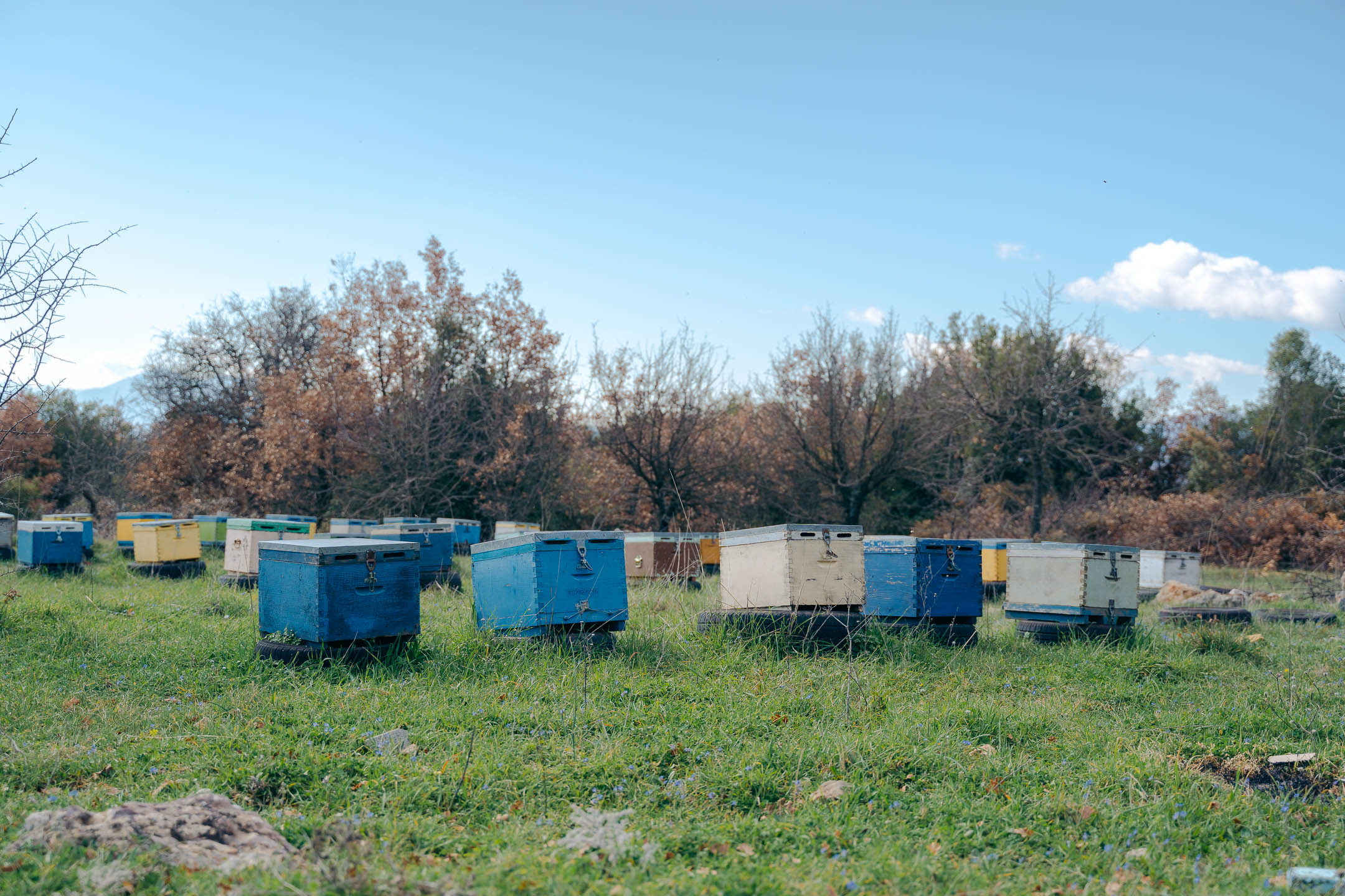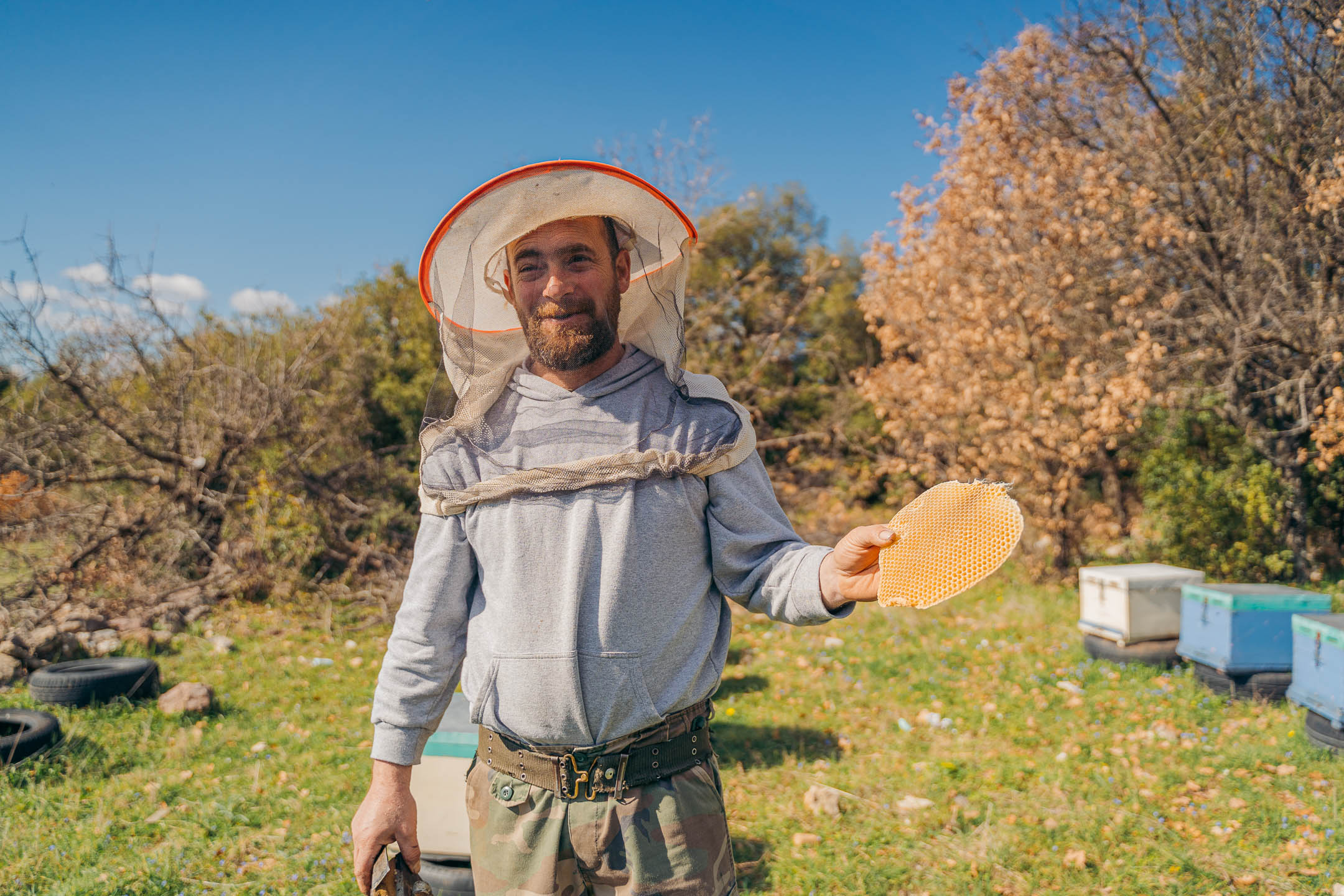 «Είναι κάποιος από εσάς αλλεργικός στις μέλισσες;» ήταν το πρώτο πράγμα που μας ρώτησε και αφού του απαντήσαμε αρνητικά, μας είπε ότι έχει δύο μάσκες και μπορούμε να πάμε μαζί του. Κάναμε μία μικρή διαφοροποίηση στο πρόγραμμά, αφήσαμε το Ελληνικό για αργότερα και βρισκόμαστε να ακολουθούμε τον νέο μας φίλο, τον μελισσοκόμο Γιώργο Μπίρη σε κάποια δρομάκια που ούτε καν αναφέρονται στο gps. Περάσαμε από ένα στάβλο με πρόβατα και καμία δεκαριά άγρια τσοπανόσκυλα, συνεχίσαμε σε ένα κατηφορικό δρόμο με μακρινή θέα στον κάμπο της Μεγαλόπολης. Ακολουθήσαμε ένα μικρό δρομάκι, που στοιχημάτιζα ότι από εκεί περνάει αυτοκίνητο μόνο όταν ο Γιώργος θέλει να πάει στα μελίσσια του, και τελικά φτάσαμε.