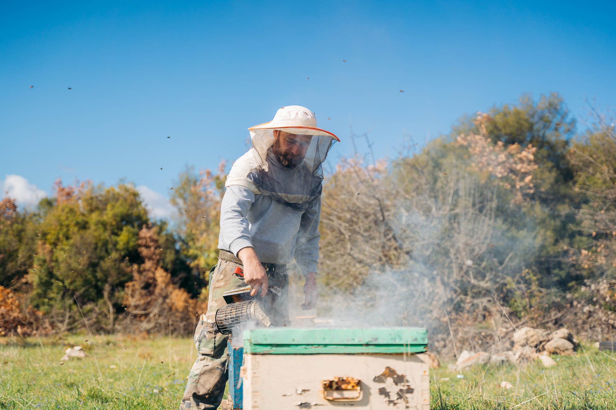 Ανεβαίνοντας από την Αρχαία Γόρτυνα προς τον Ελληνικό Αρκαδίας, ένα λευκό φορτηγάκι είναι σταματημένο στη μέση του δρόμου. Κάποιος έχει κατέβει και κόβει μερικά κλαδιά. «Ένα λεπτό και έφυγα», μας λέει και συνεχίζει τη δουλειά του. «Τι τα κάνεις αυτά;» τον ρωτάμε. «Τα θέλω για να καπνίσω τις μέλισσες». Προφανώς και δεν αφήσαμε αυτή την ευκαιρία να πάει χαμένη. Πιάσαμε την κουβέντα, εκεί στη μέση του δρόμου, και μας προσκάλεσε να πάμε να δούμε τις κυψέλες και τη διαδικασία.