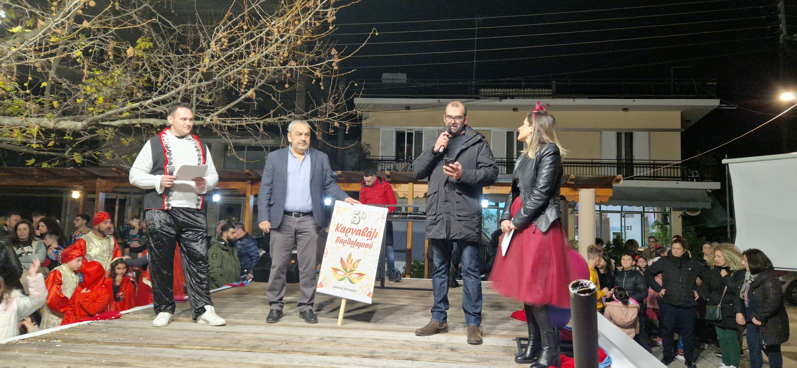 Με μία πανδαισία μουσικής και χρωμάτων υποδέχθηκαν οι διοργανωτές μικρούς και μεγάλους που βρέθηκαν στην πλατεία του Αγίου Ιωάννη, στην καρδιά του Βαρθολομιού, προκειμένου να παρακολουθήσουν τη φαντασμαγορική τελετή έναρξης του 5 ου καρναβαλιού. Οι παρουσιαστές της βραδιάς κ.κ. Ιωάννα Καπετανάκη και Κωνσταντίνος Κωνσταντινόπουλος παρουσίασαν τα γκρουπ που πρόκειται να συμμετάσχουν στη μεγάλη αποκριάτικη παρέλαση της πόλης ενώ παράλληλα ανακοίνωσαν τους παρουσιαστές του φετινού καρναβαλιού.