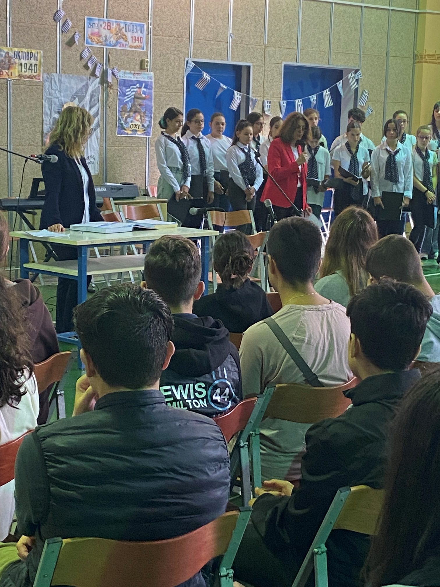 Στη συνέχεια παρουσιάστηκε το χρονικό των γεγονότων του έπους του 1940, ένα μεγάλο κεφάλαιο στην ένδοξη ιστορία του ελληνικού έθνους, το οποίο πλαισιώθηκε από οπτικοακουστικό υλικό και από τραγούδια που απέδωσε η χορωδία του σχολείου υπό τη διεύθυνση της κ. Κωνσταντίνας Σακκά- Κυρίτση. Ο εορτασμός ήταν αφιερωμένος σε όλους τους Έλληνες που ενωμένοι υπερασπίστηκαν τα ιδανικά και την πατρίδα τους, πολέμησαν με γενναιότητα, αντιστάθηκαν και θυσιάστηκαν, όταν απειλήθηκε η ακεραιότητα της χώρας. Το ηχηρό «ΟΧΙ» των Ελλήνων αποτελεί το κατόρθωμα της ομοψυχίας και της αποφασιστικότητάς τους. Επίσης επιδιώχθηκε να γνωρίσουν οι μαθητές/μαθήτριες τις συνθήκες και τη φρίκη του πολέμου. Έμφαση δόθηκε στα αθώα θύματα του πολέμου, τα παιδιά.