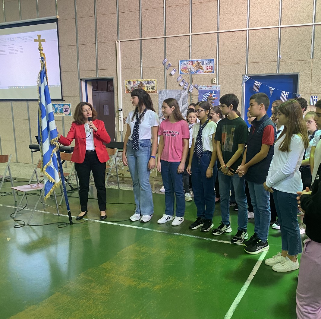 Στην αρχή η Διευθύντρια του σχολείου κ. Μαρία Μπαντούνα ανέγνωσε το μήνυμα του Υπουργού Παιδείας, Θρησκευμάτων και Αθλητισμού κ. Κυριάκου Πιερρακάκη για την επέτειο του «ΟΧΙ». Ακολούθησε η ανάγνωση του Πρακτικού του Συλλόγου Διδασκόντων για τον ορισμό σημαιοφόρου και παραστατών του σχολείου καθώς και η παράδοση της σημαίας στις σημαιοφόρους από τη Διευθύντρια.