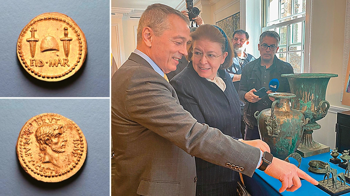Όσο για το χρυσό νόμισμα, η εμπορική αξία του οποίου εκτιμάται σε πάνω από 4 εκατομμύρια δολάρια, αυτό κατασχέθηκε από ιδιώτη διακινητή, και αποτελεί ένα από τρία αντίστοιχα που υπάρχουν σε ολόκληρο τον κόσμο. Πρόκειται για ένα εξαιρετικά σπάνιο νόμισμα το οποίο συνδέεται με τις ειδούς του Μαρτίου, την ημέρα, δηλαδή, που δολοφονήθηκε ο Ιούλιος Καίσαρας και κόπηκε στους Φιλίππους, την περίοδο 42 – 44 π.Χ. Φέρει στην εμπρόσθια όψη την κεφαλή του Βρούτου και στην οπίσθια τα όπλα της δολοφονίας του Ιουλίου Καίσαρα.