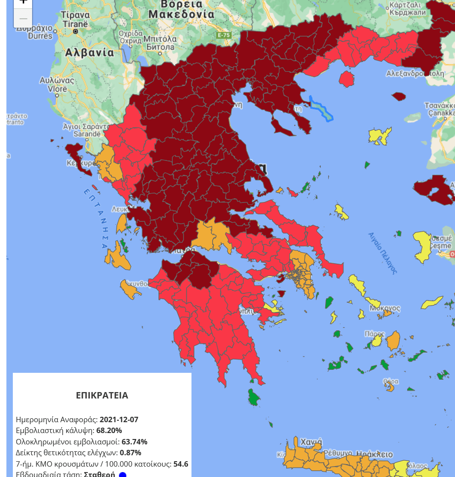 Στο βαθύ κόκκινο πέρασε μία ακόμη περιοχή της Ελλάδας, καθώς ξεπέρασε το όριο συναγερμού του ιικού φορτίου, ενώ συνολικά επιδείνωση της επιδημιολογικής κατάστασης σε τρεις περιοχές και βελτίωση σε δυο, αποκαλύπτει ο ανανεωμένος επιδημιολογικός χάρτης που παρουσιάζει η Πολιτική Προστασία.