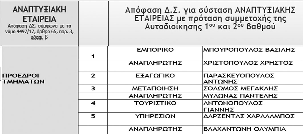 Ειδικότερα, δημιουργεί θεματικούς τομείς ευθύνης, ενώ προχωρά και στη δημιουργία Αναπτυξιακής Εταιρείας, στην οποία θα προταθεί η συμμετοχή και της Αυτοδιοίκησης.
