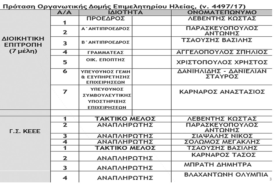 Με την υιοθέτηση μιας νέας οργανωτικής δομής ξεκινά τη θητεία της η νέα Διοίκηση του Επιμελητηρίου Ηλείας. Εφαρμόζει άμεσα ένα καινοτόμο, αποκεντρωμένο μοντέλο λειτουργίας, προκειμένου το Επιμελητήριο να ανταποκριθεί στις σύγχρονες ανάγκες των μελών του και να