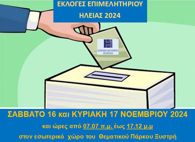 Η Εκλογική Επιτροπή του Επιμελητηρίου Ηλείας γνωστοποίησε στα μέλη του, ότι οι εκλογές για την ανάδειξη νέου Διοικητικού Συμβουλίου αυτού θα διεξαχθούν στον εσωτερικό χώρο του Θεματικού Πάρκου Ξυστρή, στις 16 και 17 Νοεμβρίου, ημέρες Σάββατο και Κυριακή και ώρες από 07.07 π.μ. έως 17.12 μ.μ.