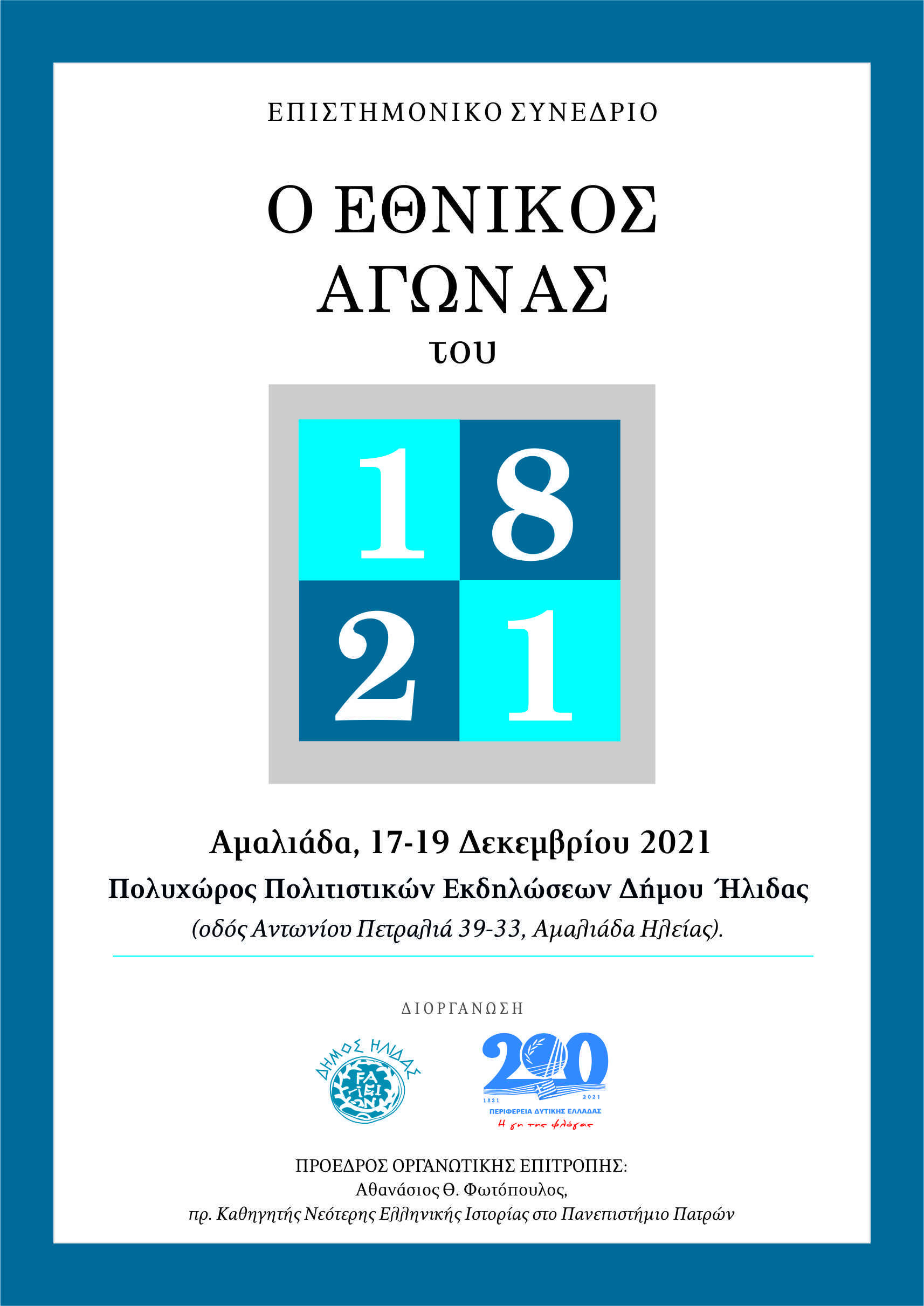 Με μεγάλο ενδιαφέρον αναμένεται το επιστημονικό συνέδριο «Ο Εθνικός Αγώνας του 1821», που θα πραγματοποιηθεί στην Αμαλιάδα 17-19 Δεκεμβρίου στον Πολυχώρο Πολιτισμού του Δήμου Ήλιδας, στο οποίο θα πραγματοποιηθούν σημαντικές ανακοινώσεις από επιστήμονες και