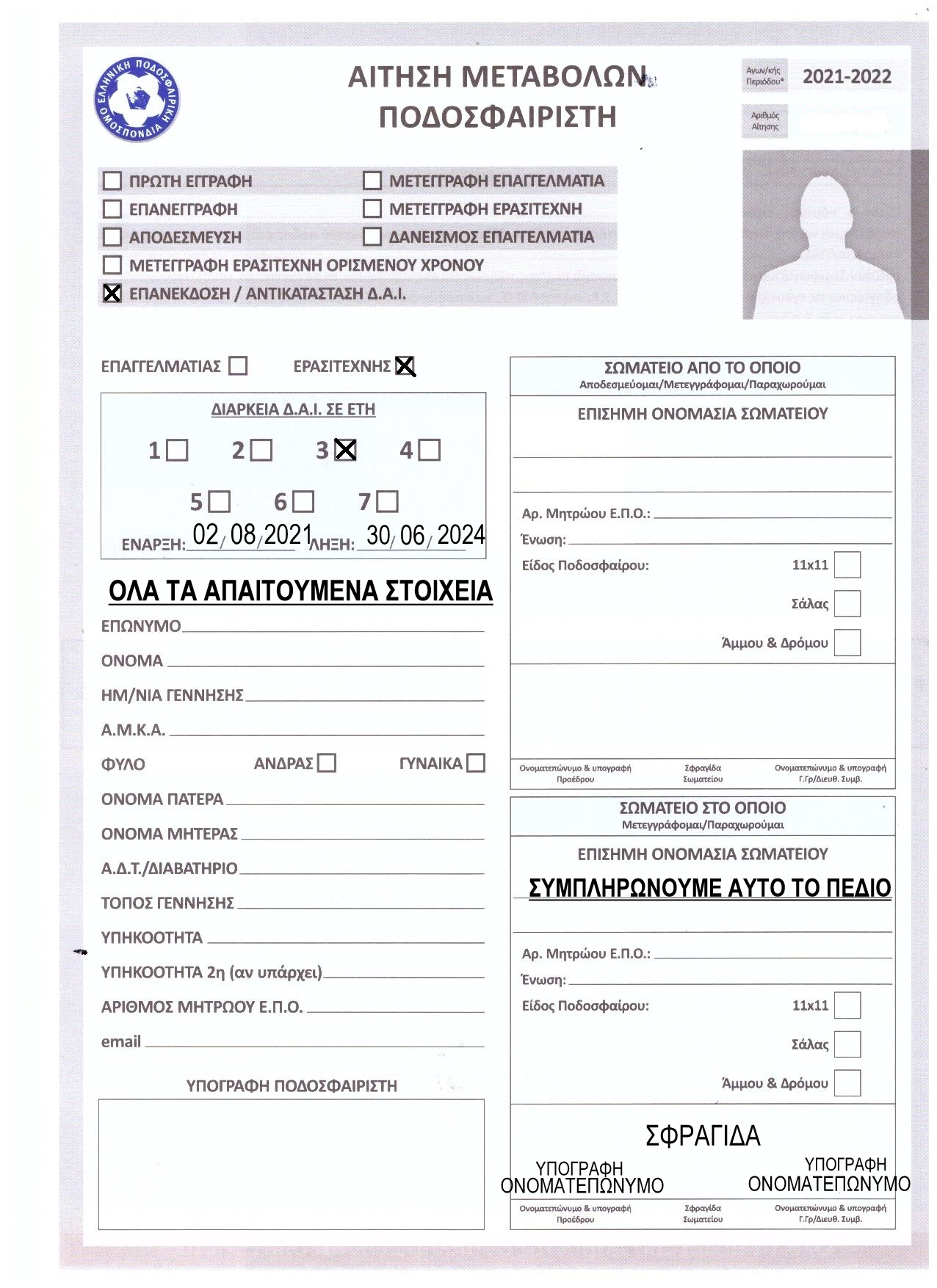 Στο νέο έντυπο αίτησης μεταβολών ποδοσφαιριστή στο εμπρόσθιο μέρος είναι