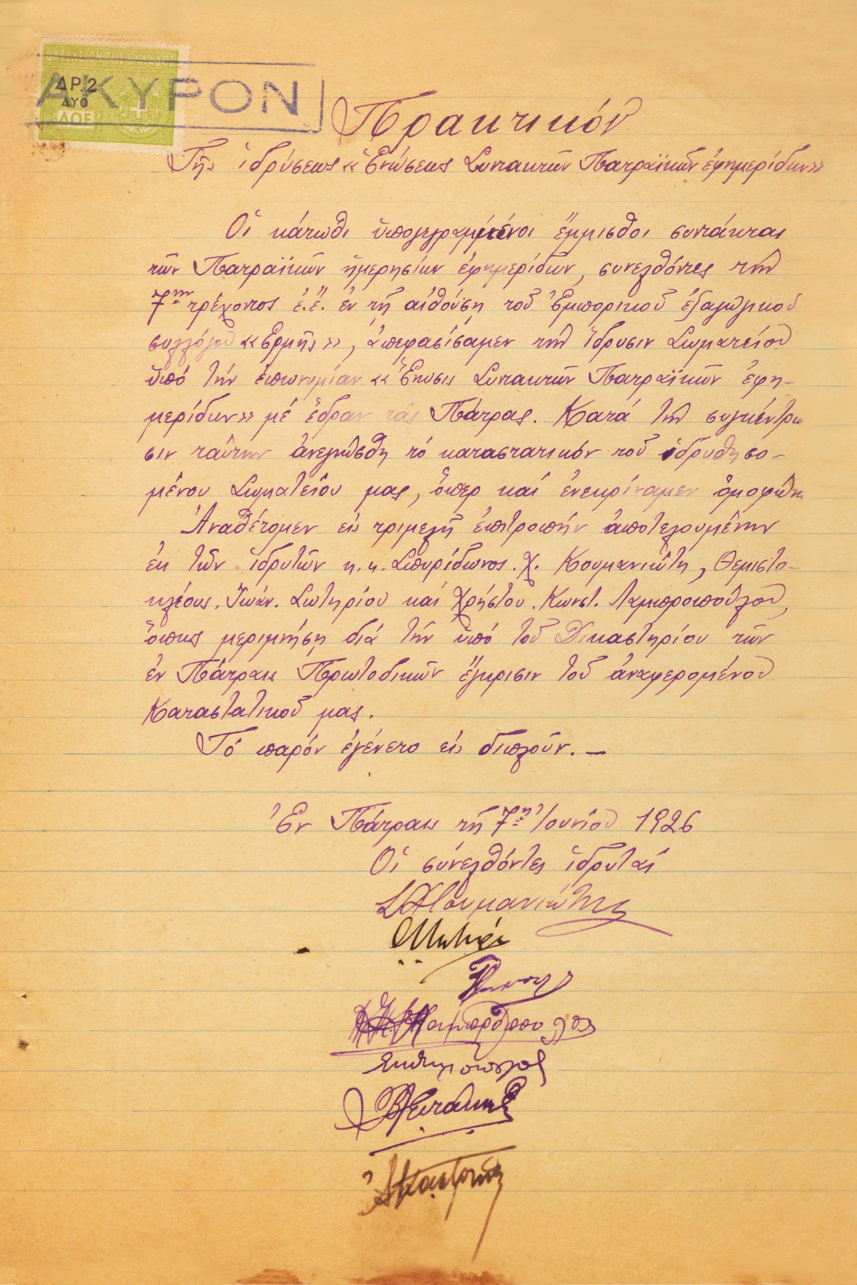 Χρονιά – σταθμός αποτέλεσε το 1926, οπότε συγκροτήθηκε η “Ένωσις Συντακτών Πατραϊκών Εφημερίδων”. Πρόεδρος στο πρώτο Διοικητικό Συμβούλιο ήταν ο Σπύρος Κουμανιώτης, γραμματέας ο Θέμης Σωτηρίου και ταμίας ο Χρήστος Λαμπρόπουλος, ως ταμίας.