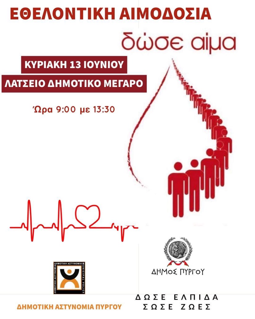 Αιμοδοσία την Κυριακή 13 Ιουνίου από τις 09:00-13:30 στο Λάτσειο Δημοτικό Μέγαρο.