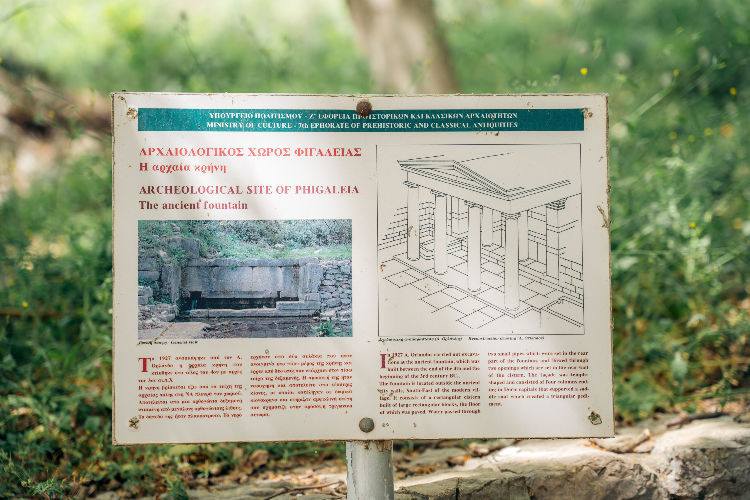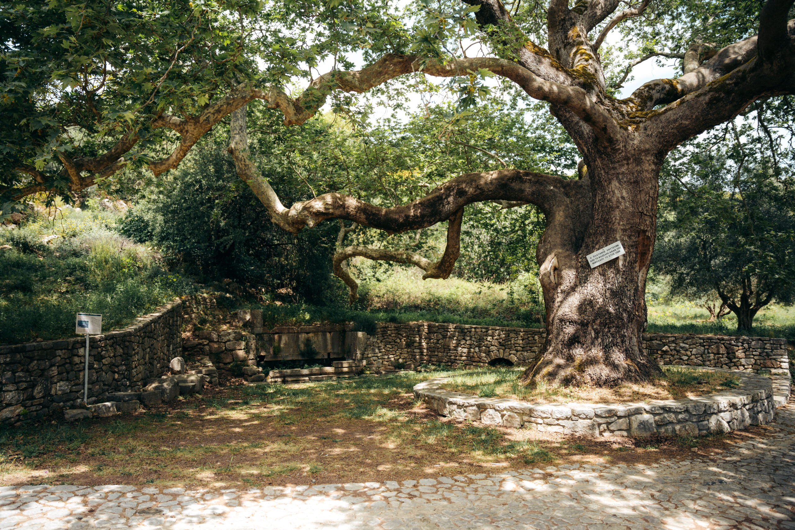 Υπάρχουν δύο δρόμοι από τους οποίους μπορεί κανείς να προσεγγίσει το φαράγγι. Εμείς επιλέξαμε να ακολουθήσουμε μία κυκλική διαδρομή, όπου φεύγοντας από τη Ζαχάρω, κινηθήκαμε προς την Κυπαρισσία και στρίψαμε αριστερά προς τη Νέα Φιγαλεία. Κάναμε μία σύντομη στάση στον οικισμό και ακολουθήσαμε το δρόμο προς Φιγαλεία. Υπάρχει μία επιλογή να αφήσει κανείς εδώ το αυτοκίνητό του και να κατέβει το μονοπάτι μέχρι τους καταρράκτες. Εδώ, θα δούμε την αρχαία κρήνη, η οποία εντοπίστηκε το 1927, από τον Α. Ορλάνδο, και σύμφωνα με τις εκτιμήσεις, κατασκευάστηκε στο τέλος του 4ου με αρχές του 3ου αι. π.Χ. Η πρόσοψή της είναι ναόσχημη και διέθετε 4 κίονες. Καθίσαμε για λίγο στον αιωνόβιο πλάτανο και συνεχίσαμε με κατεύθυνση τους καταρράκτες.