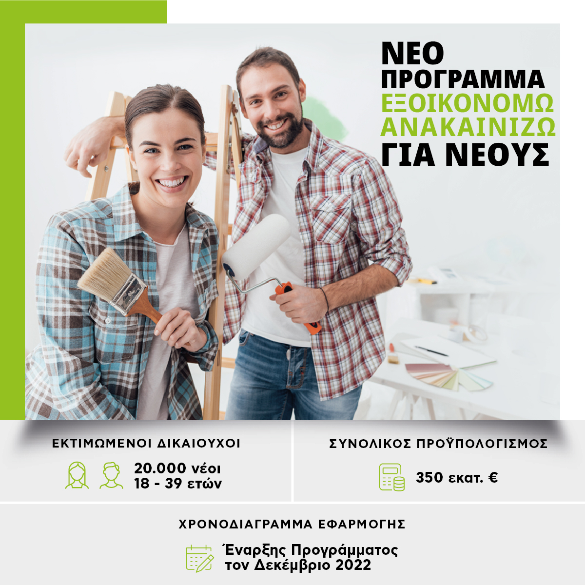 Το νέο πρόγραμμα έχει προϋπολογισμό 300 εκατ. ευρώ και σύμφωνα με το υπουργείο Περιβάλλοντος θα δώσει τη δυνατότητα σε 20.000 νέους ηλικίας από 18 έως 39 ετών, να αναβαθμίσουν ενεργειακά και να ανακαινίσουν το σπίτι τους.