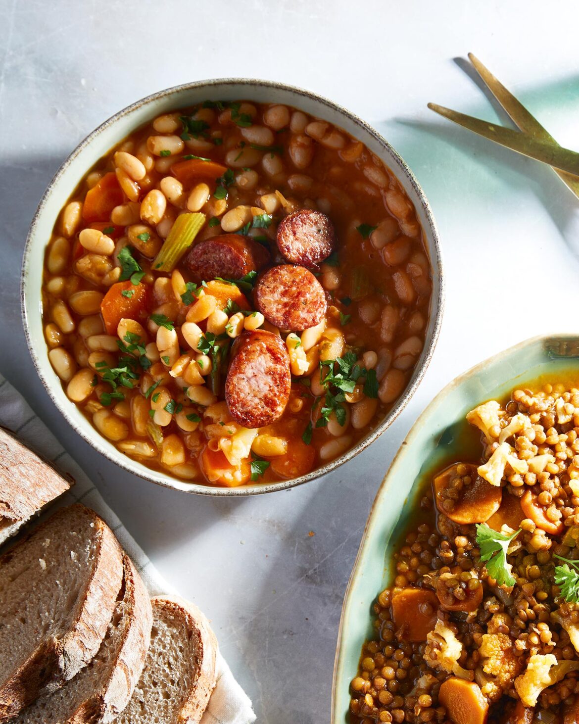 - Για την πικάντικη φασολάδα με λουκάνικα, ξεκινάμε ξεπλένοντας καλά τα φασόλια με άφθονο κρύο νερό και τα βάζουμε σε μια μεγάλη κατσαρόλα με 1.200 ml κρύο νερό και βράζουμε σε δυνατή φωτιά.